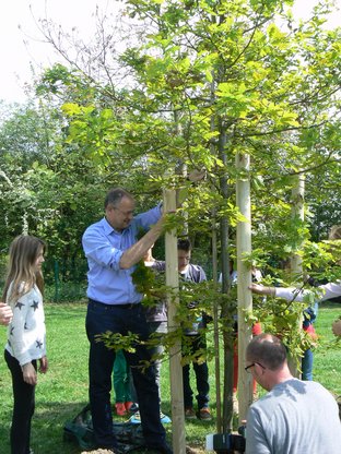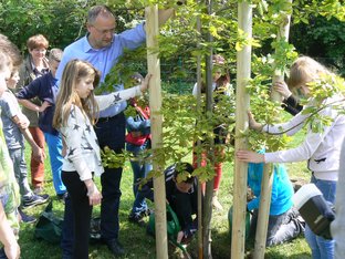 Der etwa 4 m große Baum wurde mit tatkräftiger Unterstützung vom Bürgermeister, Dietmar Persian, und einer 5. Schulklasse der Montanus-Schule eingepflanzt.