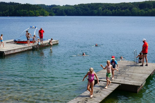 Mittags ging es zurück zu der DLRG-Wachstation, wo gleich drei ausgebildete DLRG-Retter schon auf die Kinder warteten, um das Schwimmen zu überwachen. Die Kinder durften in einem Rundparkour von Steg zu Steg schwimmen, was bei den Temperaturen auch alle sehr gerne machten. Ebenso wie zwei Ratsmitglieder.