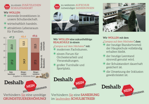 Wie sehe unsere Stadt, wie sehe unsere Schullandschaft aus, wenn der Bürgerentscheid erfolgreich wäre? Wir hätten neben dem Grundschulneubau zwei Schulruinen (die beiden Grundschulen) und zwei halbleer stehende Schulkomplexe (Hauptschule und Realschule). Der Grund dafür ist der demographische Wandel: Zukünftig stehen für die Haupt- und Realschule nur noch 60 – 70 Kinder zur Verfügung. Das ergibt 2 Realschulklassen und 1 Hauptschulklasse, oder 2 1/2 Realschulklassen und ½ Hauptschulklasse. Wir hätten zwei nicht optimal genutzte Schulgebäude. Wo bleibt da die Vernunft, die Schule macht?
