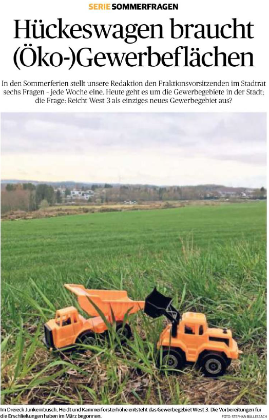 Die Grünen sehen den Flächenverbrauch sehr kritisch. Mit der Entscheidung für West III sind weitere 230.000 m² Fläche als Gewerbegebiet ausgewiesen worden. Das gemeinsamen Ziel sollte sein, dass in dieses Gebiet durch verschiedenen Maßnahmen die Energie- und CO2-Bilanz gesenkt wird. Möglichkeiten ergeben sich z.B. durch die Versorgung mit regenerativem Strom oder die Nutzung und Speicherung von Abwärme, die Förderung klimafreundlicher Mobilität, Reststoffverwertung sowie die Verbesserung des Kleinklimas durch Begrünung und Regenwasserversickerung.