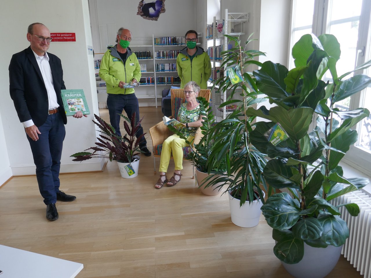 Am 24.08.20 erfolgte die Übergabe der Pflanzen für die Stadtbibliothek durch die GRÜNEN Hückeswagen. Im Beisein von Fachbereichsleiter Alexander Stehl (Stadtverwaltung) übergaben Andreas Wurth und Utz Geßner als Vertreter der GRÜNEN die gespendeten Pflanzen an Frau Regine Stefer (Leiterin Stadtbibliothek Hückeswagen). Nach der Neugestaltung der Bibliothek, jetzt ergänzt um den Pflanzenschmuck, ergibt sich ein ansprechendes Ganzes. Auch in Zeiten von Corona hat die Stadtbibliothek eine hohe Akzeptanz in der Bevölkerung. Nach der Umgestaltung und den Neuerungen hat sich das Angebot der Stadtbibliothek erheblich erweitert und ist noch attraktiver geworden.