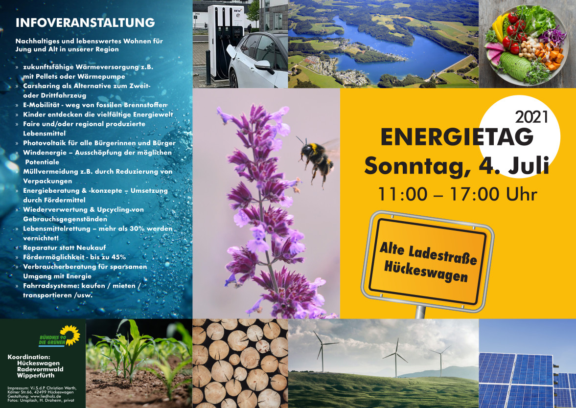 Mit dem Energietag 2021 wurde, erstmalig in Hückeswagen, die Vielfältigkeit und die Zusammenhänge von Energie im täglichen Leben aufgezeigt. In Zeiten von Klimadiskussionen hat die, als Gemeinschaftsveranstaltung der drei GRÜNEN Ortsverbände Hückeswagen, Radevormwald und Wipperfürth initiierte und ausgerichtete, Infoveranstaltung gezeigt, dass Energie nicht nur Heizen und Strom bedeutet.