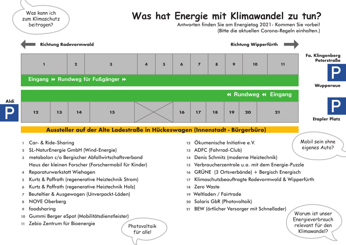 Beim Energietag 2021, von Bürger für Bürger, sollen möglichst viele Informationen zum Thema Energie, energieabhängiger Produkte und umfangreiche Lösungen dazu vorgestellt werden. Auch wenn der Klimawandel ein globales Problem ist, können wir lokal was tun! Bei dieser gemeinsamen, regionalen Veranstaltung der drei GRÜNEN Ortsverbände aus Hückeswagen, Radevormwald und Wipperfürth können Bewohnerinnen und Bewohner ihre Energiefragen stellen. Mit den gestiegenen Energiekosten suchen viele Menschen nach alternativen Lösungen zur Kostenbegrenzung. Dabei haben schon viele die Notwendigkeit einer CO² Senkung erkannt und jeder macht in seinem Umfeld einiges möglich und seien es nur kleine Schritte. Der individuelle CO² Fußabdruck gibt Aufschluss über die Potentiale. Wir wollen tagaktuelle Themen vorstellen, wo kommt der regenerative Strom der Zukunft, sei es nun aus Photovoltaik oder aus Windkraft, her. Oder Strom zum Heizen und Kühlen, sowie für die Elektromobilität mit verschiedenen Lösungsansätzen inkl. der erforderlichen Ladesäulen. Informationen zu Pellets und Wärmepumpen bilden die Eckpunkte für eine Alternative zur Verheizung fossiler Brennstoffe. Neben einer hochwertigen Gebäudedämmung gilt es die Grundlagen zur Beheizung für eine CO²-arme Zukunft zu entwickeln. Mit einer Energie- und Herstellerberatung lassen sich zukunftsfähige Lösungen aufzeigen und mit individuellen Fördermitteln gibt es vielfältige finanzielle Hilfsmittel dazu Von Mülltrennung oder die Wiederverwendung ausrangierter Stücke der Einrichtung, vieles kann instandgesetzt werden oder findet einen neuen Nutzer. Der Umgang mit und die Verwendung von Rohstoffen wie auch die Weiterverwendbarkeit durch foodsharing oder Upcycling werden erläutert. Rohstoffe und Handel aus fernen Ländern beinhalten einen erheblichen Anteil an der weltweiten Erzeugung von CO². Alternativen sind regionale Produkte. Auch ohne eigenes Auto können Kurzstrecken mit dem Fahrrad, dem Carsharing oder im ÖPNV zurückgelegt werden. Auch hierzu werden Lösungen vorgestellt. Mit dem Forschermobil sollen auch die Kleinen die ENERGIEWELT spielend kennen lernen.